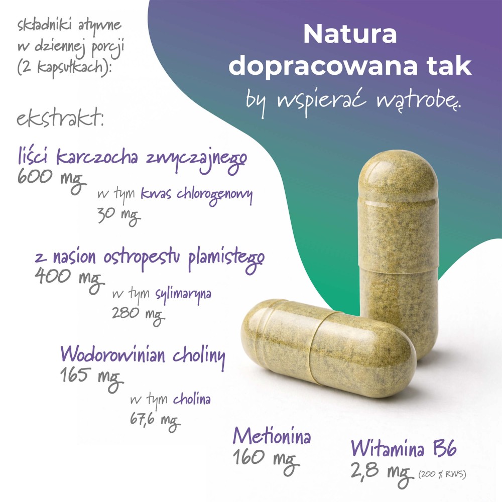 ✔ Naturalne ekstrakty roślinne – karczoch i ostropest o standaryzowanej zawartości substancji aktywnych.