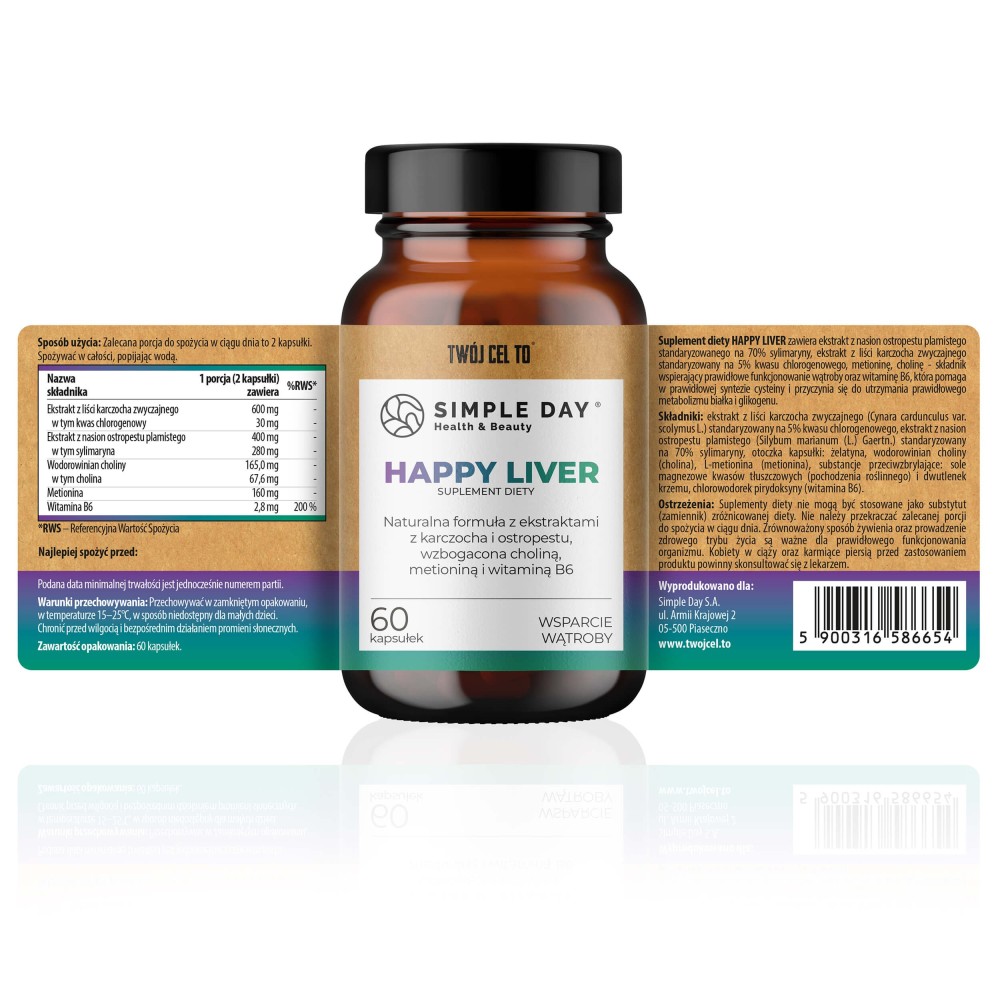 Happy Liver to suplement diety, który wspiera naturalne funkcje wątroby, pomaga w jej regeneracji i wspomaga procesy detoksykacji. Formuła oparta na synergii natury i nauki – z ostropestem, karczochem, choliną, metioniną i witaminą B6 – została opracowana po to, by przywracać lekkość i wewnętrzny balans.