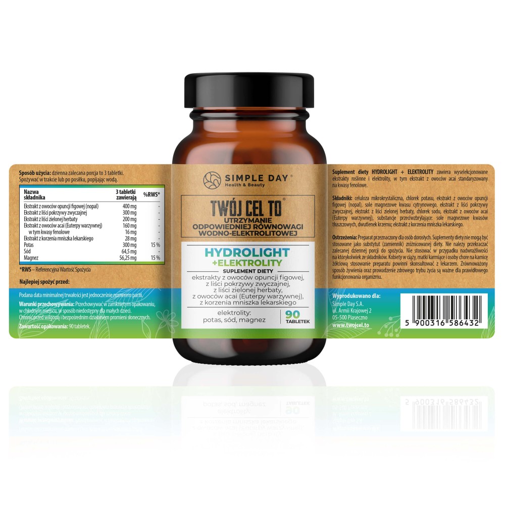 Hydrolight + Elektrolity to zaawansowany suplement diety, który wspiera naturalną eliminację nadmiaru wody z organizmu, jednocześnie uzupełniając kluczowe minerały - potas, sód i magnez. To połączenie składników roślinnych i elektrolitów, które pomaga zachować lekkość, wspiera regenerację mięśni oraz poprawia ogólne samopoczucie.