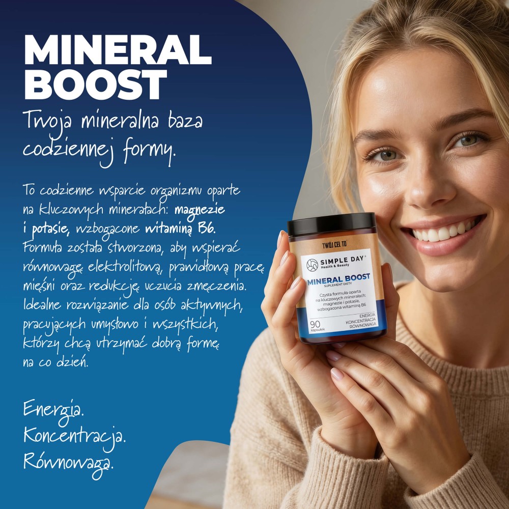 MINERAL BOOST to suplement diety przeznaczony dla osób dorosłych, które chcą świadomie wspierać organizm w codziennym funkcjonowaniu oraz uzupełniać dietę w magnez, potas i witaminę B6.