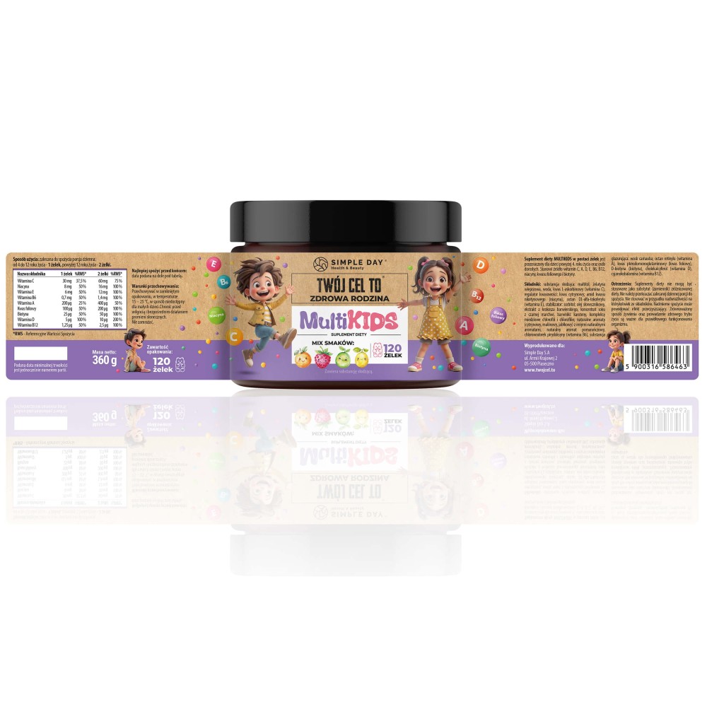 MULTIKIDS to nowoczesna multiwitamina dla dzieci i dorosłych w formie pysznych żelek - bez cukru. Stworzone z myślą o najmłodszych i ich codziennych potrzebach. Suplement diety wspiera odporność, układ nerwowy, kości i metabolizm, a przy tym zastępuje tradycyjne słodycze wartościowym smakołykiem.