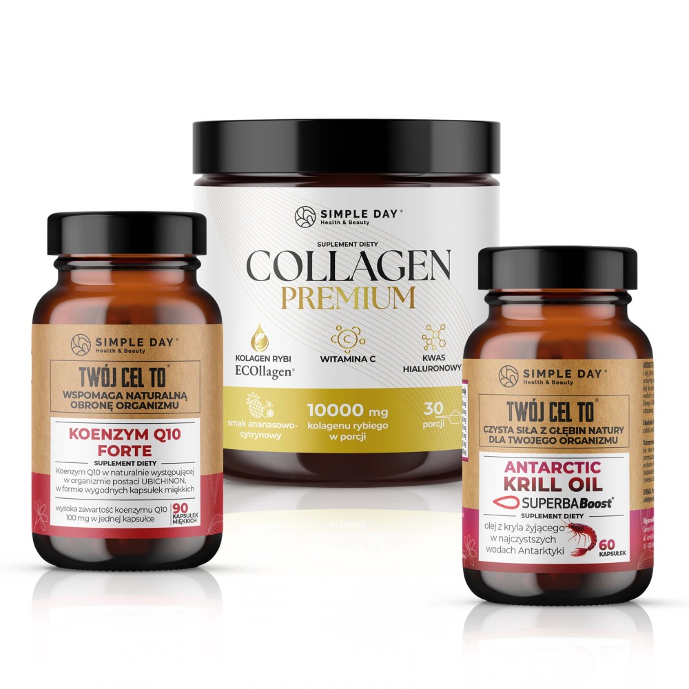 Zestaw Piękna Skóra łączy kolagen, witaminę C, Q10 i kwasy omega-3 w jednym, spójnym rytuale wspierającym organizm od wewnątrz.