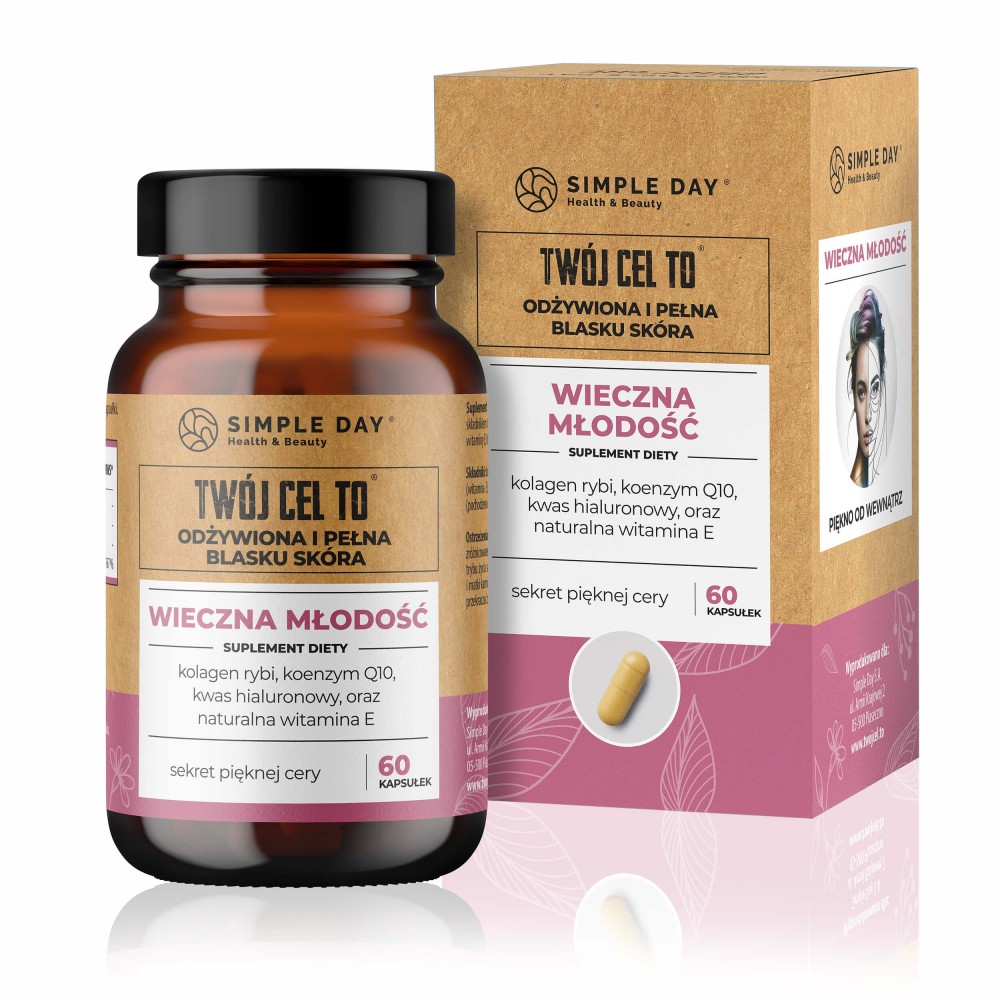 Wieczna Młodość od Twój Cel To to kompleksowy suplement diety, który łączy kolagen rybi, kwas hialuronowy, koenzym Q10 i witaminę E – cztery składniki tworzące wewnętrzną tarczę piękna.