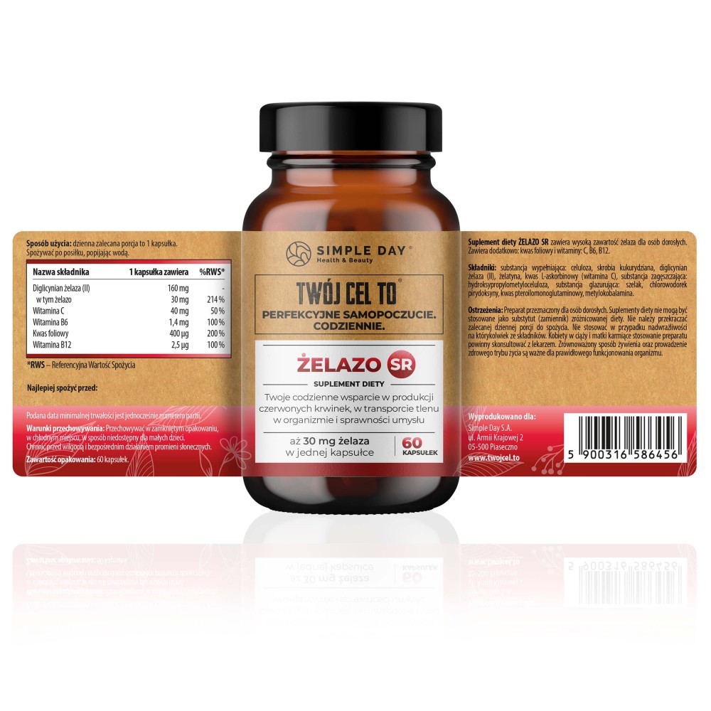 Suplement diety Żelazo SR to innowacyjna formuła opracowana specjalnie z myślą o osobach dorosłych potrzebujących skutecznego wsparcia poziomu żelaza w organizmie. Dzięki zastosowaniu technologii Slow Release (SR), preparat gwarantuje stopniowe uwalnianie składników aktywnych, co pozwala na ich lepsze przyswajanie i minimalizuje ryzyko występowania dolegliwości żołądkowo-jelitowych – typowych przy klasycznej suplementacji żelazem.