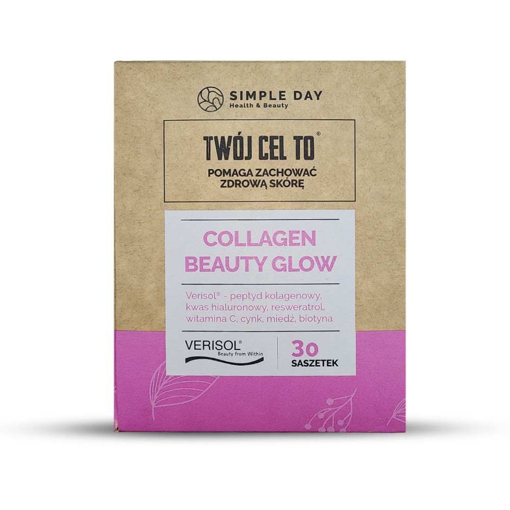 Collagen Beauty Glow - to unikalny suplement diety zawierający kolagen Verisol®, kwas hialuronowy, resweratrol, witaminę C, cynk, miedź i biotynę. Te składniki wspólnie działają na rzecz poprawy elastyczności skóry, redukcji zmarszczek oraz wzmocnienia paznokci, wspierając kompleksową pielęgnację. Verisol® to specjalnie opracowane peptydy kolagenowe, które wykazują wyjątkową zdolność do wchłaniania się i stymulowania komórek skóry do zwiększonej produkcji własnego kolagenu. Takie działanie może przyczynić się do widocznej poprawy tekstury skóry, jej gęstości oraz elastyczności. Suplementacja kolagenem sprawia, że cera staje się promienna, a skóra zdrowsza i nawilżona. Dodatkowo przyczynia się do utraty cellulitu.