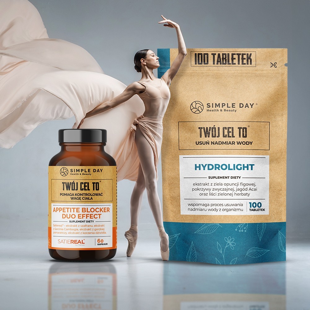 Poczuj się lekka i smukła dzięki kompleksowo dobranym suplementom Hydrolight oraz Appetite Blocker Duo Effect od Twój Cel To. Pozbądź się nadmiaru wody w organizmie oraz zahamuj uporczywe podjadanie aby szybciej zauważyć efekty odchudzania.