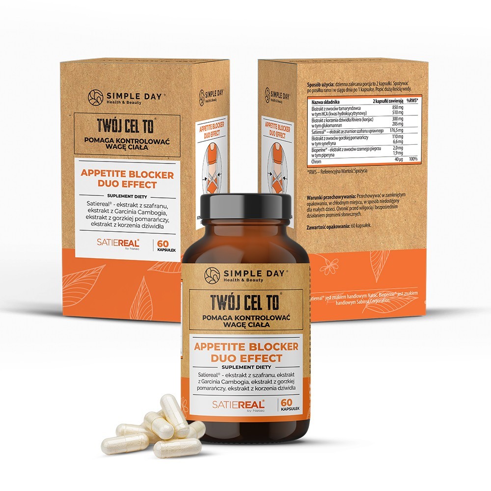Appetite Blocker Duo Effect - zawiera starannie dobraną kompozycję 6 aktywnych substancji, które wspomagają kontrolę apetytu, redukują uczucie głodu i ograniczają chęć podjadania. Jednocześnie przyczyniają się do przyspieszenia spalania tkanki tłuszczowej i wzrostu termogenezy. Ten suplement diety łączy w sobie ekstrakty z Garcinia Cambogia oraz opatentowanego Satiereal®, czyli wyciągu z szafranu, które pomagają kontrolować apetyt, zmniejszają uczucie głodu i redukują ochotę na słodycze. Dodatkowo w składzie znajdują się substancje wspierające proces spalania tłuszczu i pobudzające termogenezę – synefryna z owoców gorzkiej pomarańczy oraz piperyna z czarnego pieprzu. Skład wzbogacono również o glukomannan i chrom, wspomagające utrzymanie prawidłowej masy ciała.