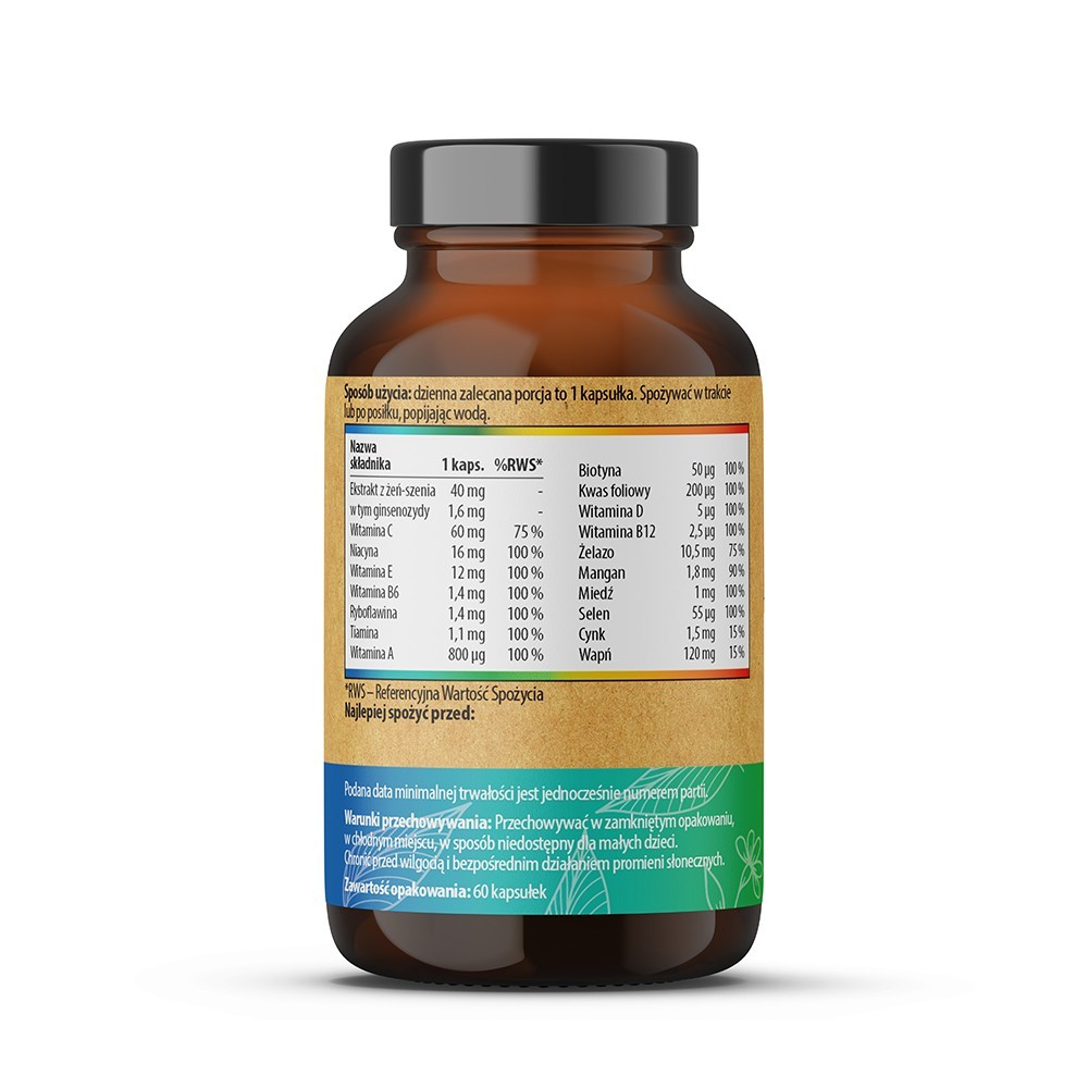 Multiwitamina zawiera 11 niezbędnych witamin oraz 6 kluczowych minerałów, w tym witaminy z grupy B, witaminę C, żelazo i żeń-szeń. Ten kompleks składników wspiera funkcje poznawcze, dodaje energii oraz wzmacnia odporność, co jest kluczowe podczas rekonwalescencji. Żeń-szeń, znany z właściwości adaptogennych, pomaga organizmowi radzić sobie ze stresem i zmęczeniem.