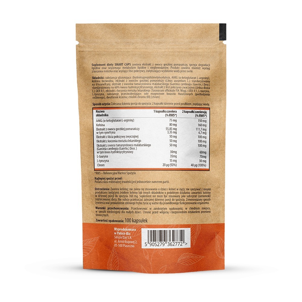 Smart Caps - energia i skupienie na najwyższym poziomie Smart Caps to suplement, który dostarczy Ci energii i poprawi koncentrację, abyś mógł sprostać każdemu wyzwaniu. Zawiera starannie wyselekcjonowane składniki, takie jak kofeina, L-tyrozyna i ekstrakty roślinne (w tym z gorzkiej pomarańczy), które wspierają metabolizm, dodają energii i zwiększają wytrzymałość. Smart Caps to doskonałe wsparcie przed treningiem, w trakcie intensywnego dnia pracy lub gdy potrzebujesz dodatkowej dawki motywacji.